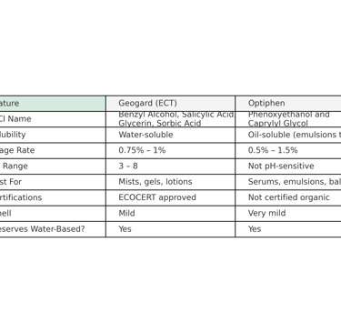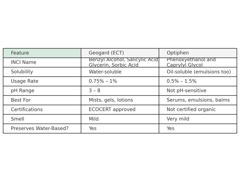 Geogard and Optiphen are different—they’re broad-spectrum, paraben-free, and considered low-tox when used correctly. Here’s a quick breakdown: